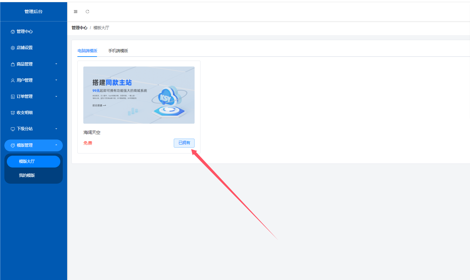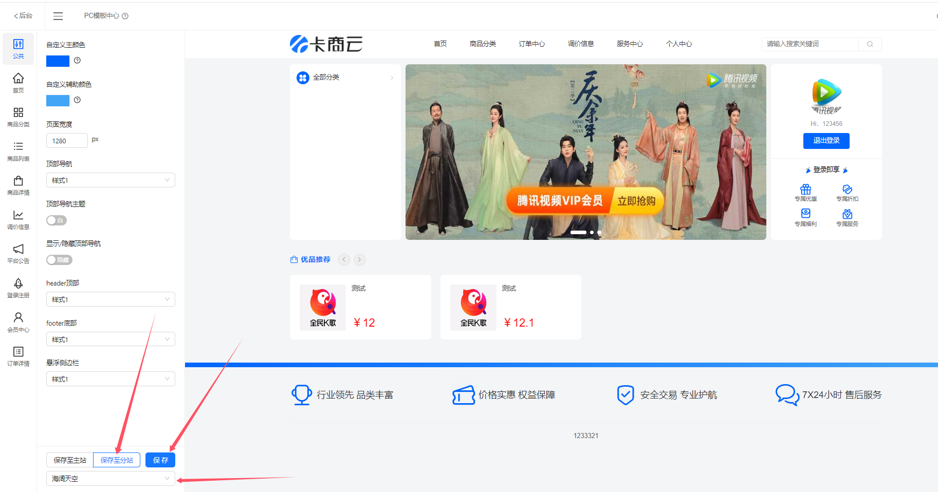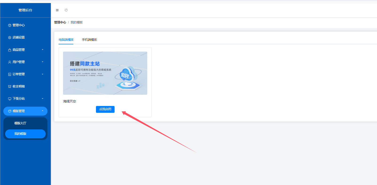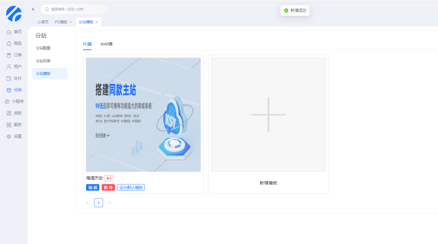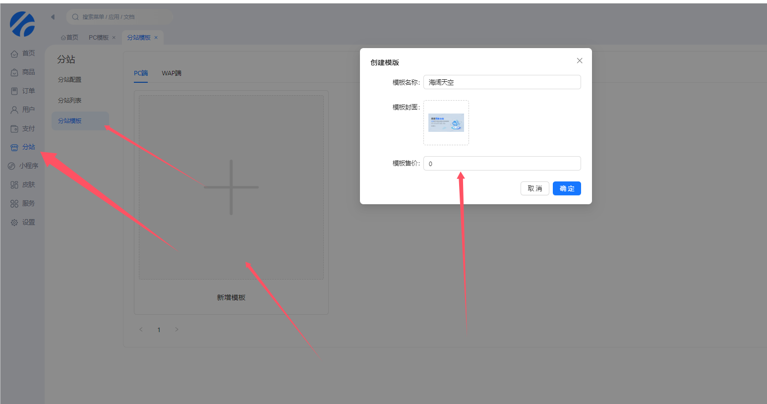 在这里可以设置模版名称和售价(设置售价后分站需要付费购买后使用)