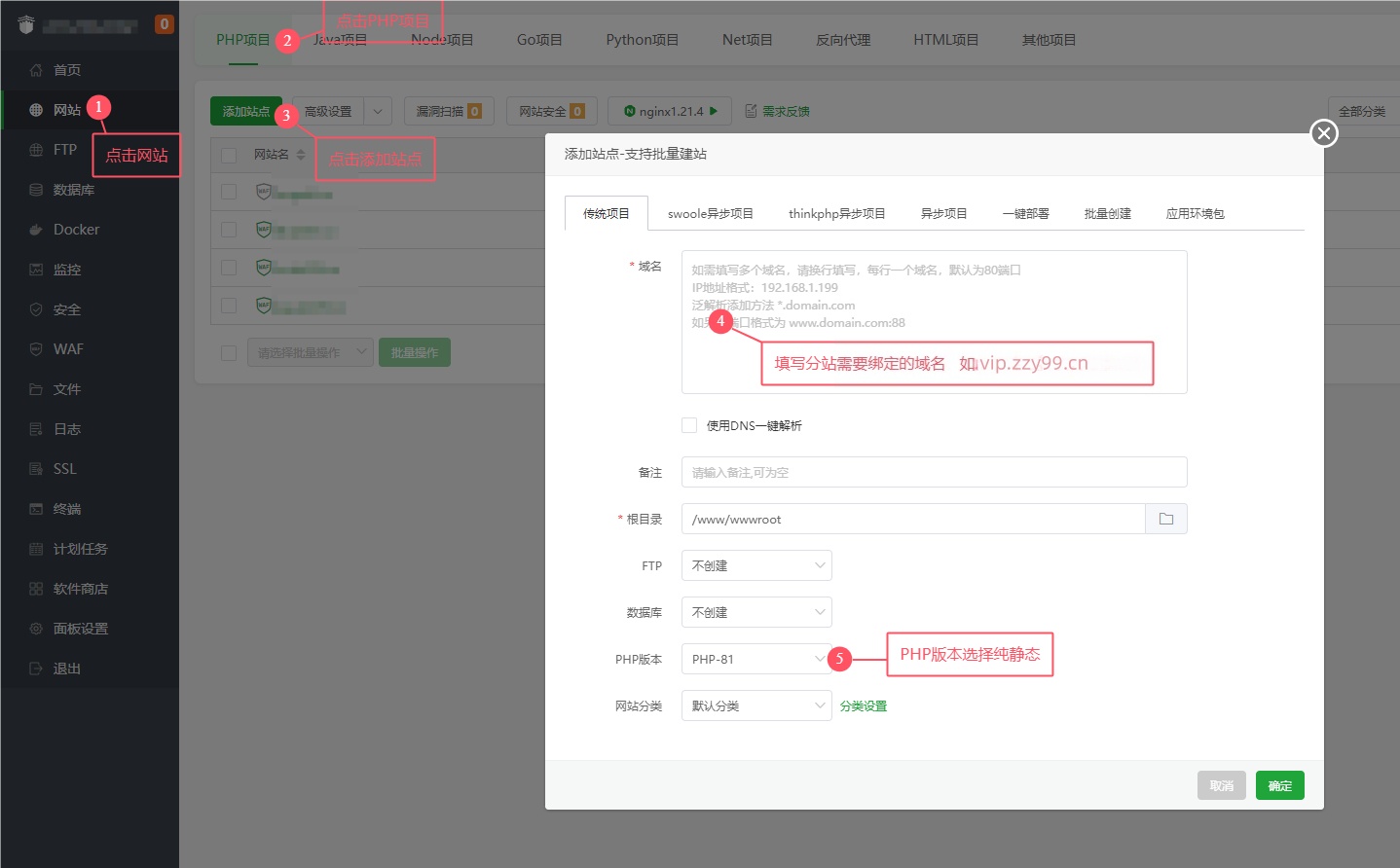 2、在宝塔面板->网站->PHP->新建一个纯静态站点。如下图所示: